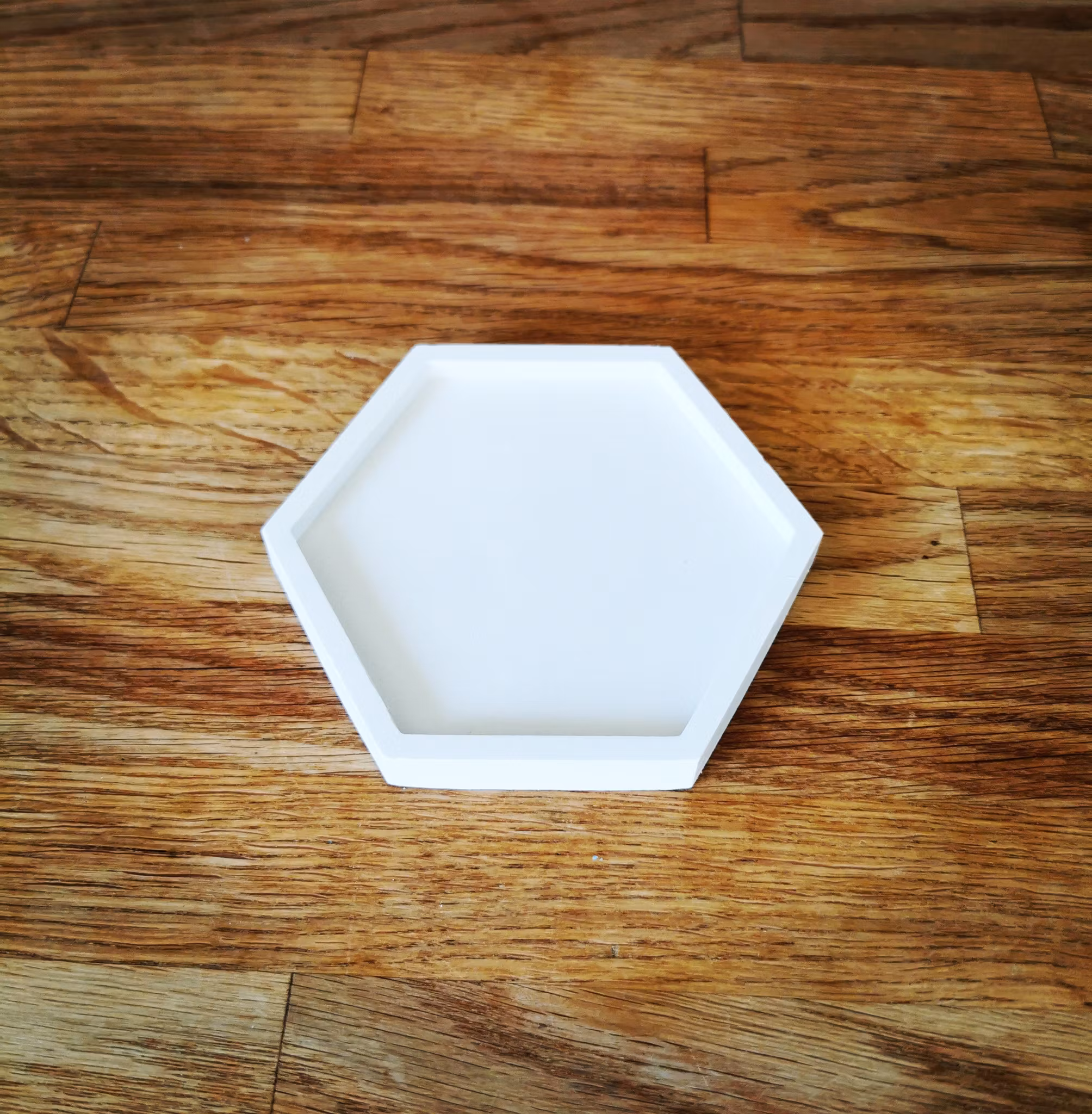 Denna ljusfat i hexagonal form, handgjord av gips, tillför modern stil och elegans till din inredning.